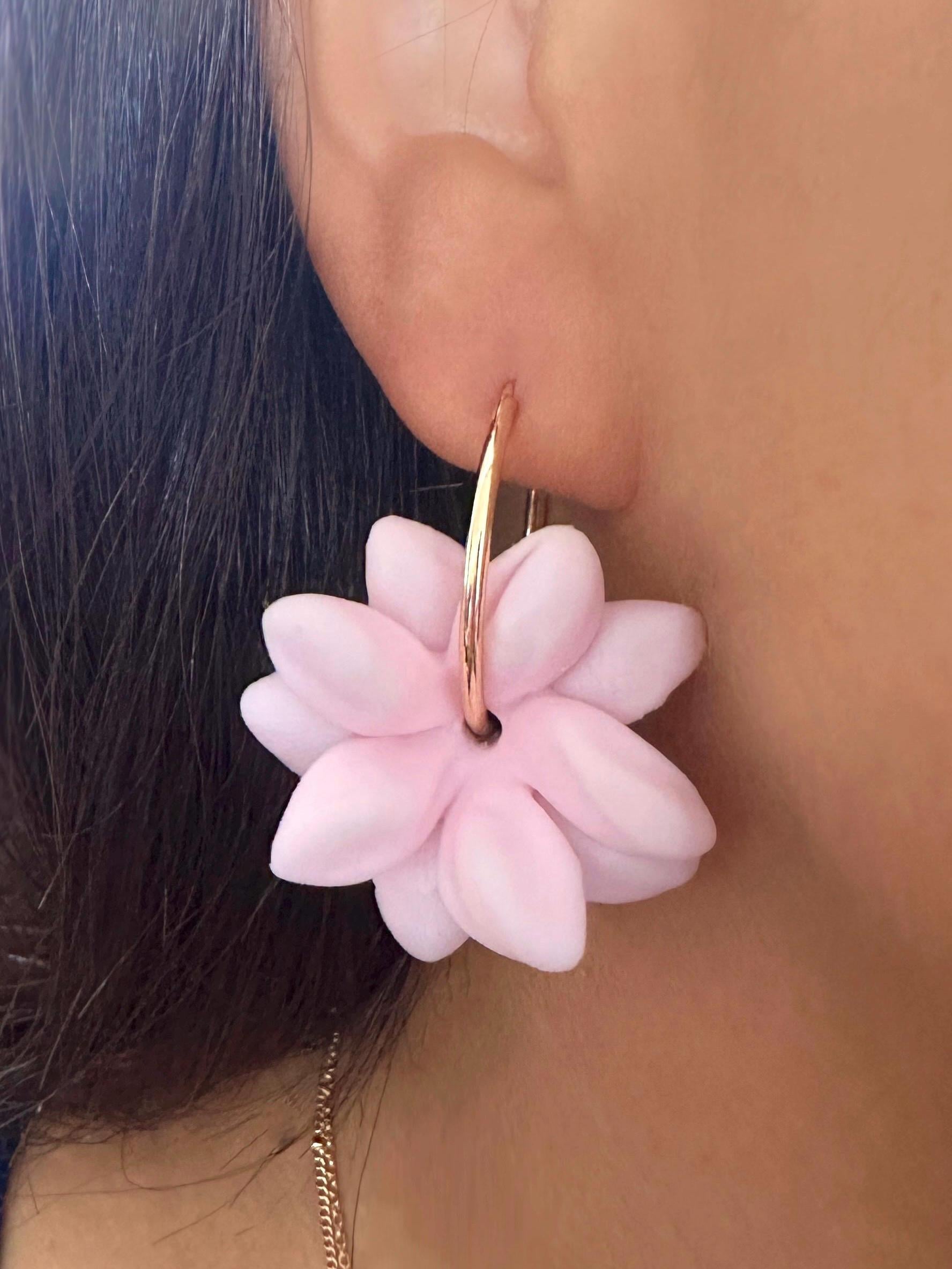 A pink pikake (jasmine blossom) flower, handcrafted from air-dry clay, hangs delicately from each 18K gold filled hoop earring.