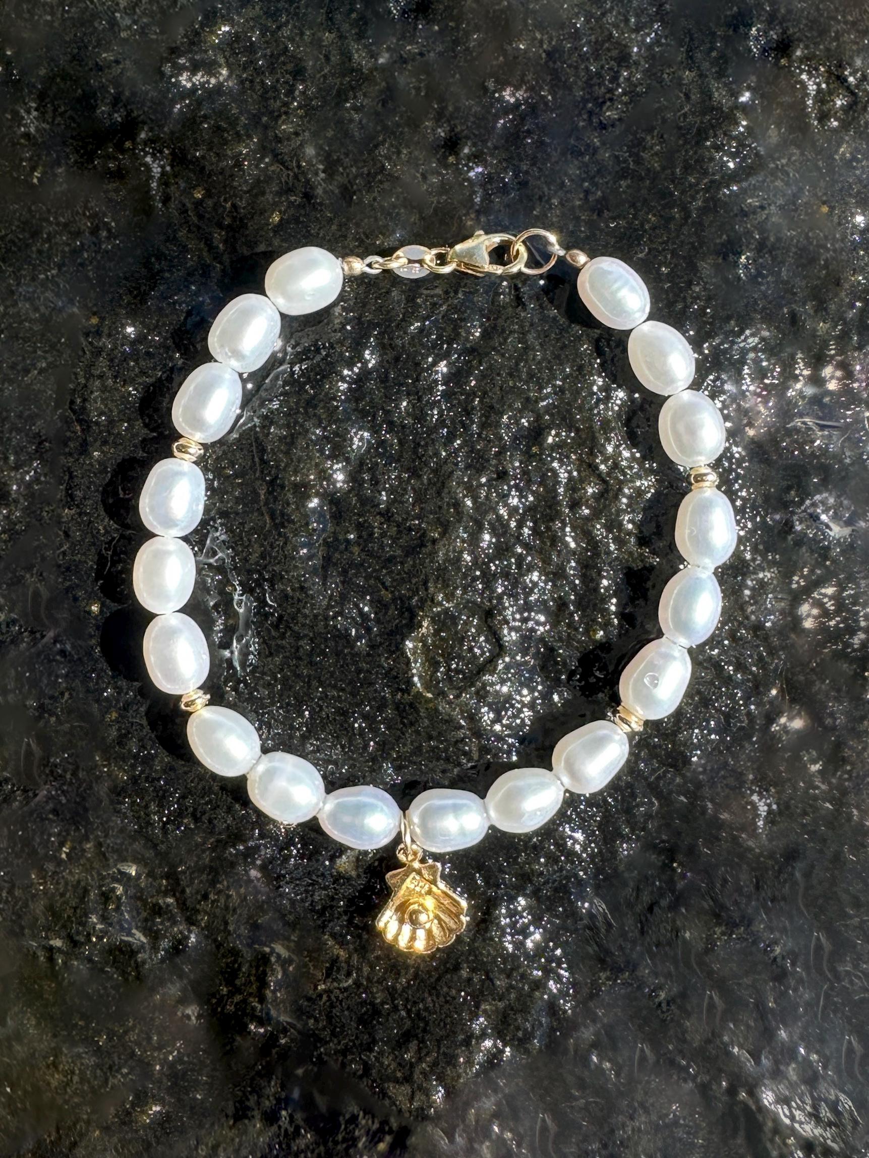 This bracelet features beautiful white freshwater pearls, 14K gold filled beads, and a 2-sided vermeil (22K gold over sterling silver) charm of a clam shell with a pearl at its center.