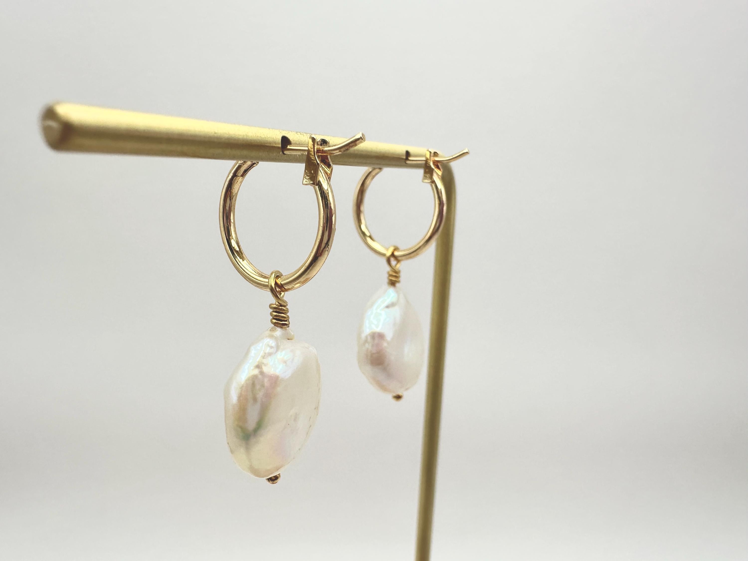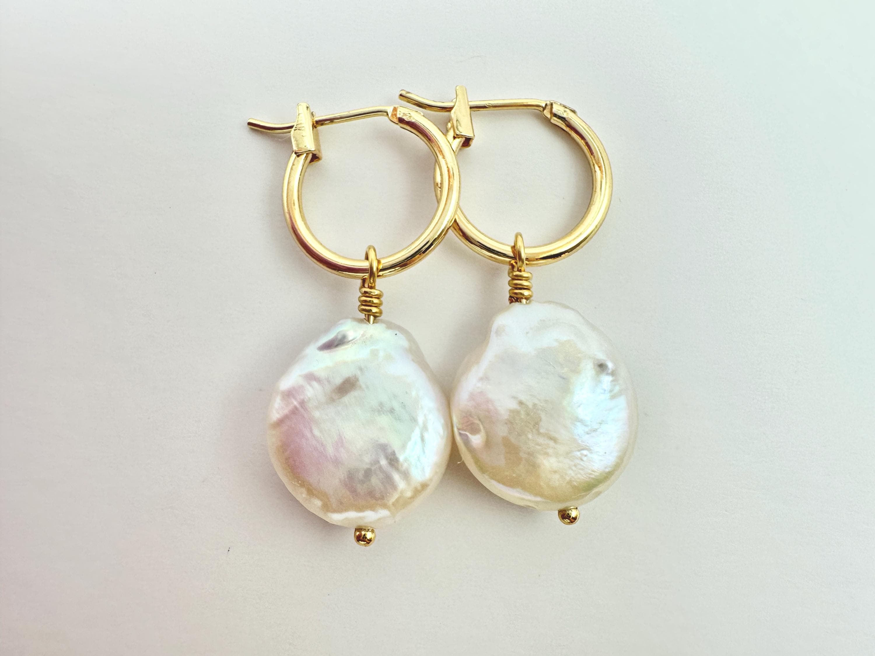 Iridescent white freshwater coin pearls on 18K gold filled hoop earrings. The pearls reflect different colors depending on the lighting and angle, so I provided multiple shots to show this effect.